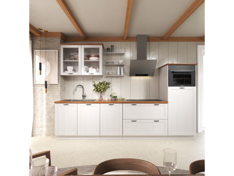 Cozinha completa composta por 5 módulos e uma prateleira na cor branco lavado com honey / coleção Alma