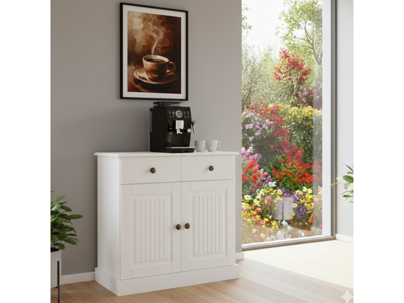 BALCÃO BUFFET APARADOR DE MADEIRA NO ACABAMENTO BRANCO LAVADO COM 1 GAVETA E 2 PORTAS / COLEÇÃO MILLE