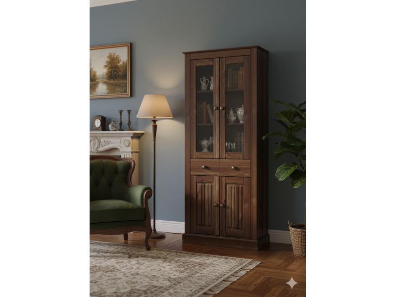 Cristaleira vitrine de madeira maciça na cor castanho amadeirado com uma gaveta | coleção Mille